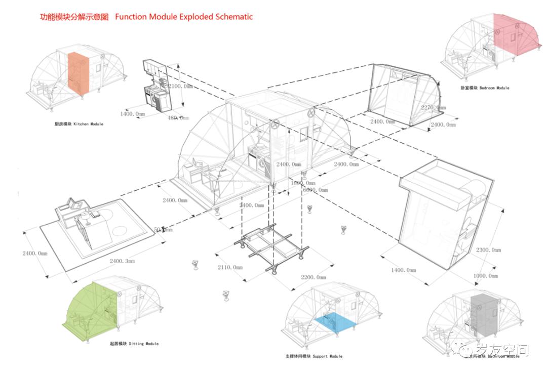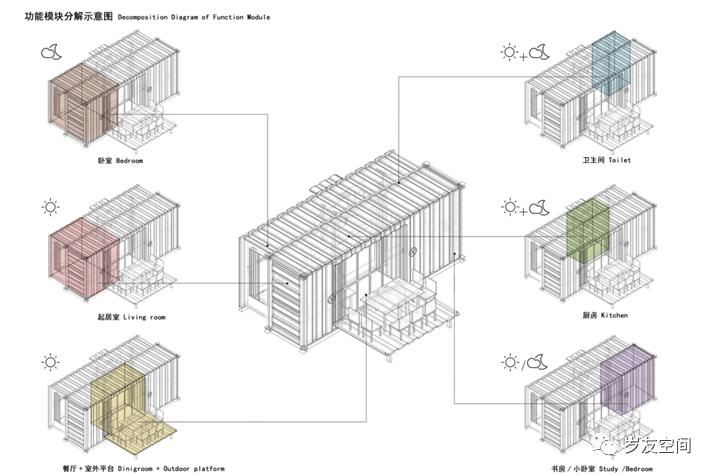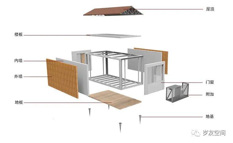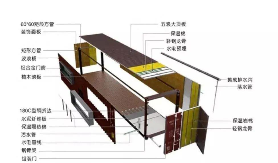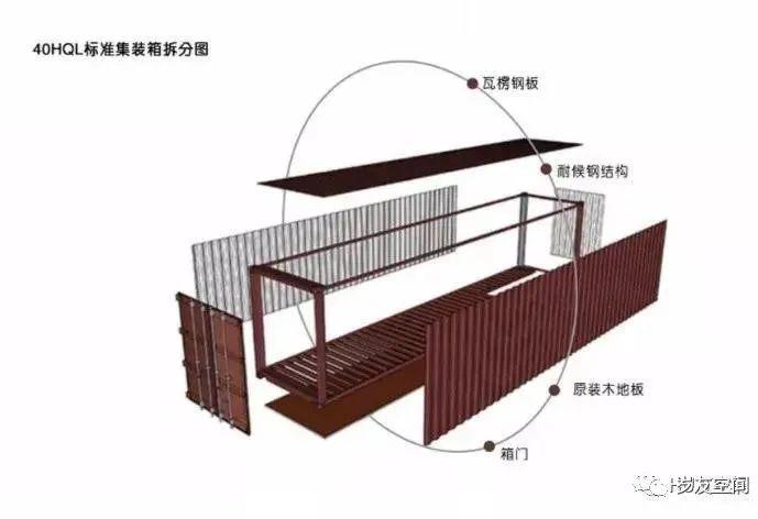 集裝箱在建筑上應(yīng)用一般采用高箱、特種箱或定制箱體來做。集裝箱建筑體系拆分圖具體如下。