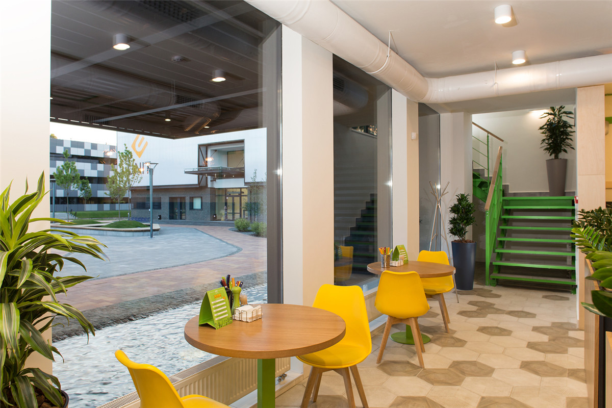 室內(nèi)外有一些共同之處。一樓也部分涂上綠色。在一樓和二樓有舒適的沙發(fā)、桌椅、椅子和植物。一樓有廚房,盥洗室和廚房。咖啡廳總面積為275平方米。