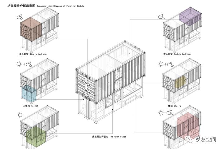 集裝箱在建筑上應(yīng)用一般采用高箱、特種箱或定制箱體來做。集裝箱建筑體系拆分圖具體如下。