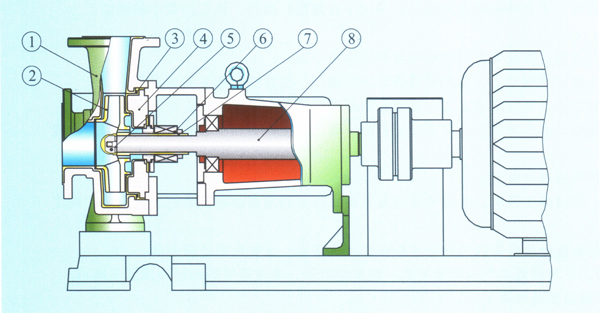 IHF泵的泵體采用金屬外殼內(nèi)襯聚全氟乙丙烯(F46),葉輪、泵蓋均采用金屬嵌件外包氟塑料整體燒結(jié)壓制成型,軸封采用外裝式波紋管機封,封環(huán)選用99.9%碳化硅,動環(huán)采用四氟填料或碳化硅。該泵具有結(jié)構(gòu)合理,耐腐強,密封性能嚴(yán)密,噪音低,壽命長。