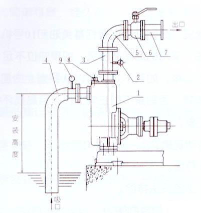 a. 吸入口的安裝高度不能超過5米,在條件許可時,吸入口的安裝高度應(yīng)盡可能地低于水池低的儲水平面,并盡量縮短吸入管的長度,少裝彎頭,這樣有利于縮短自吸時間,提高自吸功能。