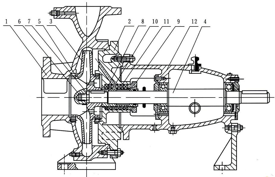 1 泵體 2 泵蓋 3 葉輪 4 軸 5 密封環(huán) 6 葉輪螺母 7 止動墊圈 8 軸套 9 填料壓蓋 10 填料環(huán) 11 填料 12 懸架軸承部件