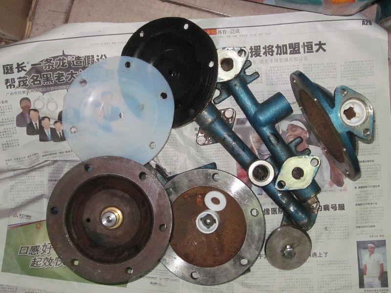 民泉碰到這樣的客戶,買了一臺(tái)隔膜泵,在正常壓力下不運(yùn)作,然后就說是我們的產(chǎn)品有問題,然后從老遠(yuǎn)的地方坐車過來,要求換貨。結(jié)果我們的技術(shù)人員只用了2分鐘就把問題給解決了。這樣就大量浪費(fèi)了客人的精力,民泉覺得不值。 其實(shí)有些隔膜泵的問題都是小問題,用戶自己都可以解決,又節(jié)省了金錢,又節(jié)約了時(shí)間。 現(xiàn)在民泉對(duì)氣動(dòng)隔膜泵產(chǎn)品常見問題進(jìn)行簡(jiǎn)答。 故障的確定: 將隔膜泵從管路中拆卸下來。空壓機(jī)正常壓力試泵。 如果是配氣閥損壞,現(xiàn)象是這樣的:泵不工作,當(dāng)你按動(dòng)配氣閥按鈕,泵也是不工作,那么初步判定是配氣閥損壞了。 如果是隔膜片損壞,現(xiàn)象是:隔膜泵工作,但是隔膜泵進(jìn)口和出口沒壓力或者壓力過小,那么就可以判斷是隔膜泵或者隔膜泵的球與球座損壞了。 經(jīng)過初步判斷,如果是 隔膜泵隔膜片損壞了,那么民泉就教你如何維修: 一,將泵拆開,先將上下進(jìn)料管和出料管拆開,拆開后取出球以及球座。 二,將整泵拆開,進(jìn)行清洗,清洗過程中注意:不要用尖銳的器物刮洗球及球座,隔膜泵對(duì)氣密性要求較高,刮花了影響氣密性,如果有損壞就必須更換。