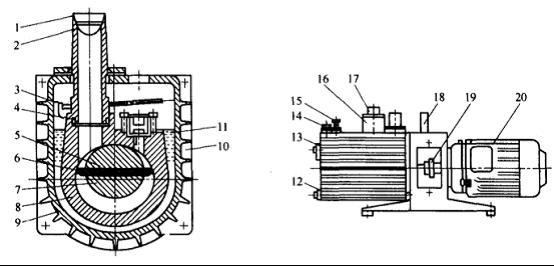 本泵是由兩個工作室前后串聯(lián)同向等速旋轉(zhuǎn),被抽氣體由前級泵腔抽入,經(jīng)過壓縮被排入后級泵腔再經(jīng)過壓縮,排出泵腔.通過減霧器排出泵外,結(jié)構(gòu)分解圖如下. ![]() 直聯(lián)式旋片真空泵結(jié)構(gòu)示意圖 1-進(jìn)氣管;2-濾網(wǎng);3-擋油板;4-進(jìn)氣管“O”形;5-旋片彈簧;6-旋片; 7-轉(zhuǎn)子;8-定子;9-油箱;10-真空泵油;11-排氣閥門;12-放泊螺塞; 13-油標(biāo);14-加油螺塞;15-氣鎮(zhèn)閥;16-減霧器;17-排氣管; 18-手柄;19-聯(lián)軸器;20-電機(jī) 感謝你對上海民泉的支持,www.dlkendo.cn |