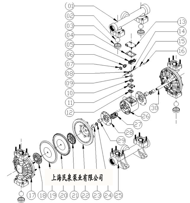 有用戶反映對于氣動(dòng)隔膜泵結(jié)構(gòu)不了解,如需更換配件時(shí),無法叫出配件的名稱,現(xiàn)將民泉?dú)鈩?dòng)隔膜泵結(jié)構(gòu)圖分解如下,你可以對照產(chǎn)品圖片及編號,訂購你需要的產(chǎn)品。 ![]()