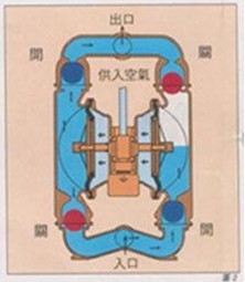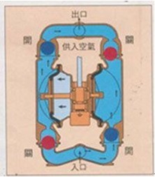 圖1:空氣經(jīng)由氣閥壓縮進(jìn)入膜片A之背面,由膜片擠壓液室。此種以空氣驅(qū)動(dòng)的方式可免除一般活塞驅(qū)動(dòng)之機(jī)械應(yīng)力,從而顯著地延長(zhǎng)膜片的壽命。在壓縮空氣將膜片A推離中心體時(shí),另一端之膜片B同時(shí)被連結(jié)之中心軸拉向中心體,此時(shí),膜片B背面之空氣由出口排放到泵體外。如此使B室形成真空狀態(tài),因而能靠外面大氣壓力之作用將流體由入口支管將閥球推離閥座使流體能自由地進(jìn)入B室直至填滿。