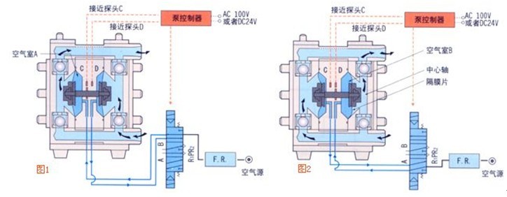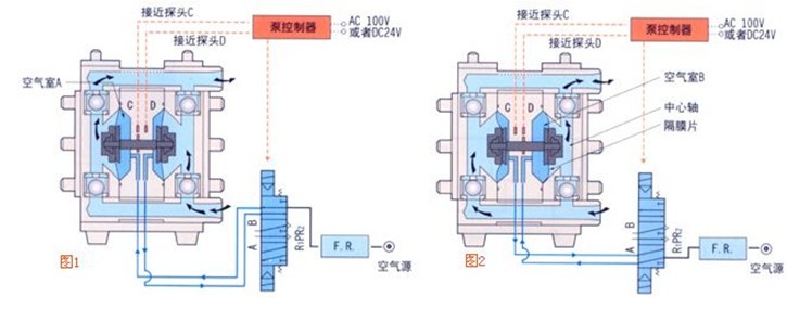 ②中心軸向左移動(dòng)到行程盡頭時(shí),被接近開(kāi)關(guān)C感知,使泵的電氣控制原件動(dòng)作控制電磁閥換向。(圖1) ③電磁閥換向以后.壓縮空氣被送入空氣室B,中心軸和膜片又同時(shí)向右方向移動(dòng)。(圖2) ④中心軸向右移動(dòng)到行程盡頭時(shí),被接近開(kāi)關(guān)D感知,使泵的電氣控制原件動(dòng)作控制電磁閥換向回到圖1的狀態(tài)。 以上動(dòng)作往復(fù)進(jìn)行,使隔膜泵連續(xù)動(dòng)作下去。 (注)除了使用專用泵的電氣控制原件外,也可使用P.L.C進(jìn)行控制。 |